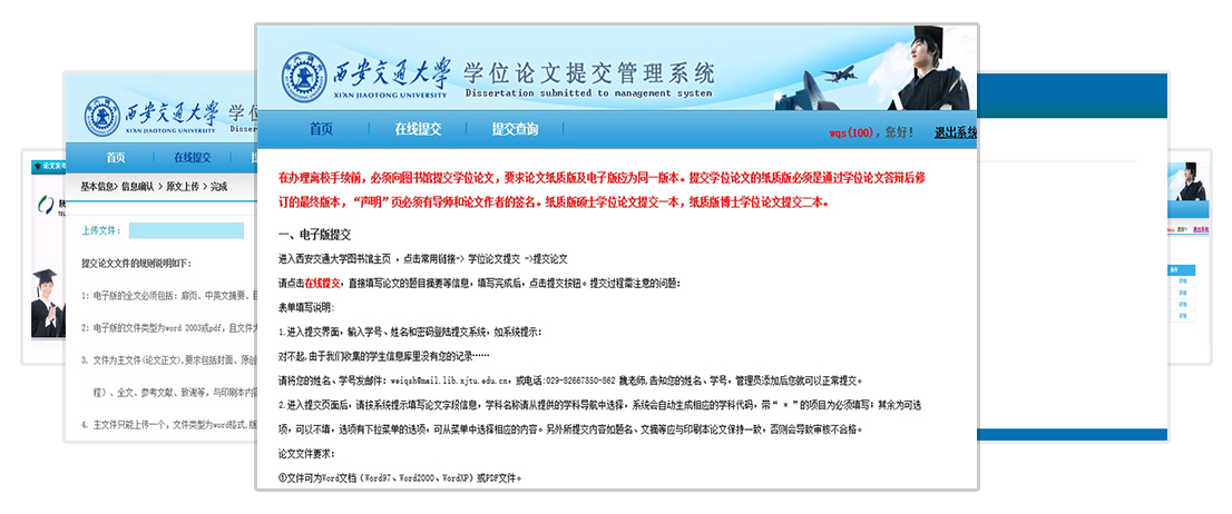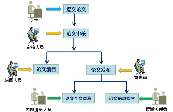 为了更好的管理学位论文,并且配合CALIS高校学位论文数据库项目的建设,西安交通大学图书馆希望建立一个多功能的学位论文管理系统。该系统主要功能包括:学生能够对论文进行在线提交、检索;编辑人员能够对提交的论文进行审核与编目、管理员能够制作标准文档、管理员能够按照CALIS的要求对论文进行发布、管理员能够回溯制作标准论文、能够与学校一卡通离校系统建立Webservice接口、与图书馆OPAC系统和知识发现系统进行数据交换等。其中关键性需求:能够充分满足论文提交管理的所有基本功能;要求学生信息一键导入,身份认证简单方便;要求学生论文元数据信息能够进行灵活配置;要求论文原文可按提交年限、保密级别灵活发布;要求分类导航、快速检索、二次检索、组合查询;要求审核任务按学院自动分配,可进行手动分配;要求学生提交信息、审核信息统计查询。