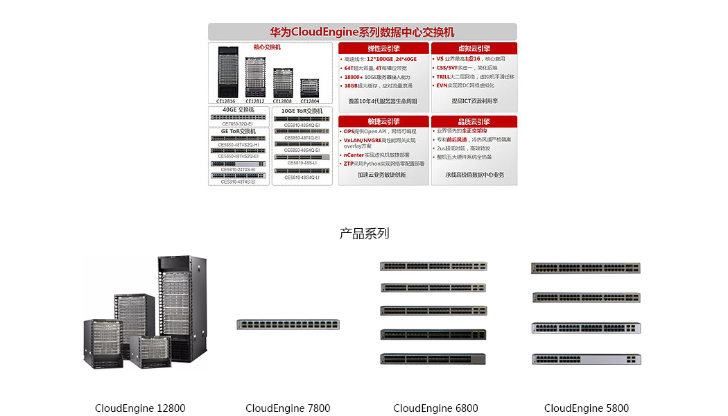 CloudEngine(以下简称CE)系列是华为公司面向下一代数据中心和高端园区推出的“云”级高性能交换机,包括全球最高配置的旗舰级核心交换机CloudEngine 12800系列,以及高性能的盒式交换机CloudEngine 6800 /5800(10GE/GE接入)系列。CloudEngine系列软件平台基于华为新一代的VRP8操作系统,支持丰富的数据中心和园区业务特性。基于CloudEngine系列交换机和华为公司齐全的传输、路由、安全及网管产品,华为公司全球发布面向下一代云计算数据中心的敏捷数据中心网络解决方案,旨在为客户打造未来十年的稳定网络架构。