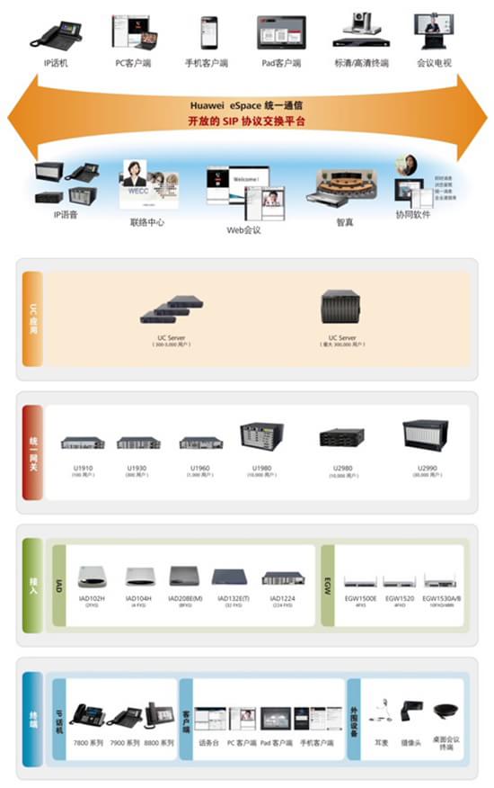 华为eSpace 统一通信解决方案融合语音、数据、视频和业务流,实现任意终端在任意时间、任意地点安全快捷接入业务平台,覆盖从SOHO工作室到超大型企业等各种规模,满足企业IP语音、协同会议、移动办公等全方位的应用要求。华为eSpace 统一通信解决方案基于SIP协议开放交换平台设计,提供多业务构建及多终端接入能力,面向企业客户提供高可靠,易部署,嵌入企业业务的统一通信解决方案。华为eSpace 统一通信解决方案融合语音、数据、视频和业务流,实现任意终端在任意时间、任意地点安全快捷接入业务平台,覆盖从SOHO工作室到超大型企业等各种规模,满足企业IP语音、协同会议、移动办公等全方位的应用要求。