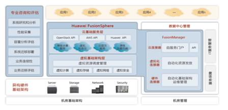 FusionCompute包括虚拟基础架构层和云基础服务层,能够实现对物理资源的虚拟化,形成IT弹性资源池,屏蔽业务对底层硬件的要求,实现对虚拟资源的调度和管理。 虚拟基础架构层主要实现对服务器、存储、网络等物理硬件资源的虚拟化,形成虚拟资源池,供上层应用使用。其功能主要包括:虚拟计算、虚拟存储、虚机网络、虚拟资源调度和管理。 云基础服务层由一系列云基础业务模块组成,向下通过虚拟化基础设施层的接口调用来管理虚拟的计算、存储与网络资源,向上通过中间件接口为业务应用提供云基础服务。其功能主要包括:弹性计算、虚拟私有云、备份容灾、弹性负载均衡等基础服务能力,同时支持OpenStack以及Amazon API接口。 实现对云计算软件和硬件进行全面的监控和管理,具有自动化资源发放和自动化基础设施运维管理两大核心功能,实现对IT业务的编排和发放以及自动部署,并向最终用户和内部运维管理人员提供运营与管理门户。华为云管理软件同时还提供一系列API接口给上层及第三方管理软件使用。